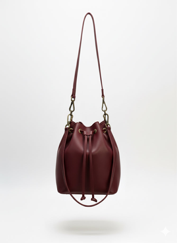 • Chiusura e Design: La caratteristica principale è la chiusura a coulisse (o a sacchetto) nella parte superiore. È dotata di laccetti sottili nello stesso materiale che, quando tirati, arricciano l'apertura, conferendo la classica forma a secchiello e garantendo la sicurezza del contenuto. L'apertura è inoltre rinforzata da occhielli in metallo, che aggiungono un dettaglio funzionale ed estetico.