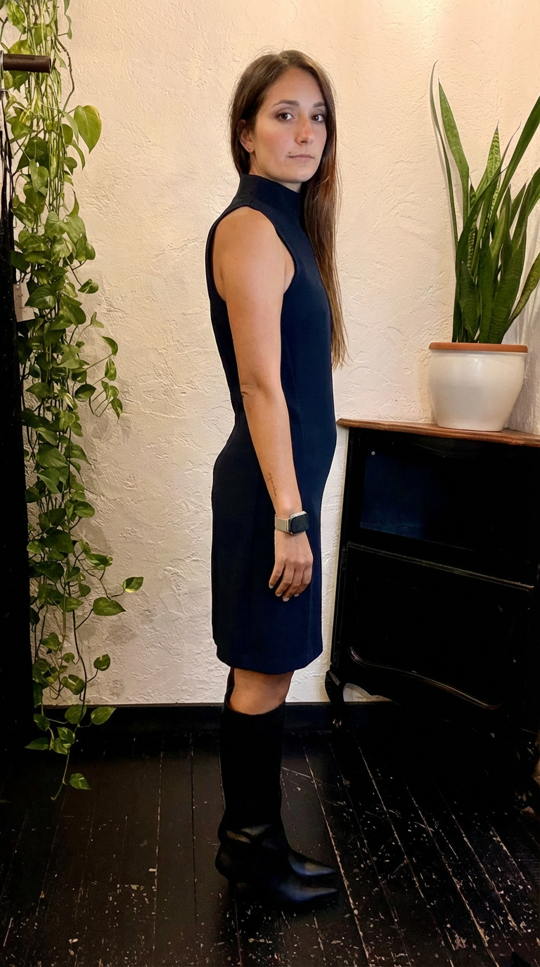 Questo abito tubino corto e senza maniche è perfetto per uno stile raffinato. Il taglio pulito esalta la figura mentre il collo alto conferisce un'aria di compostezza e fascino.