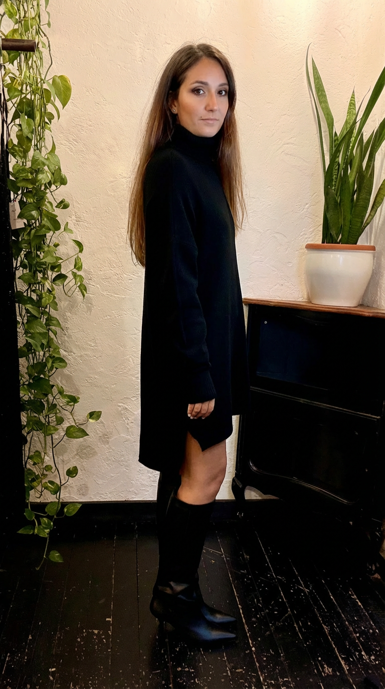 Avvolgiti in un'eleganza senza sforzo con questo mini abito in maglia dal taglio morbido e moderno. Il collo alto ti offre calore e uno stile riservato mentre la lunghezza mini e lo spacco laterale discreto aggiungono un tocco chic. La vestibilità oversize lo rende incredibilmente confortevole ma le linee pulite lo mantengono raffinato.